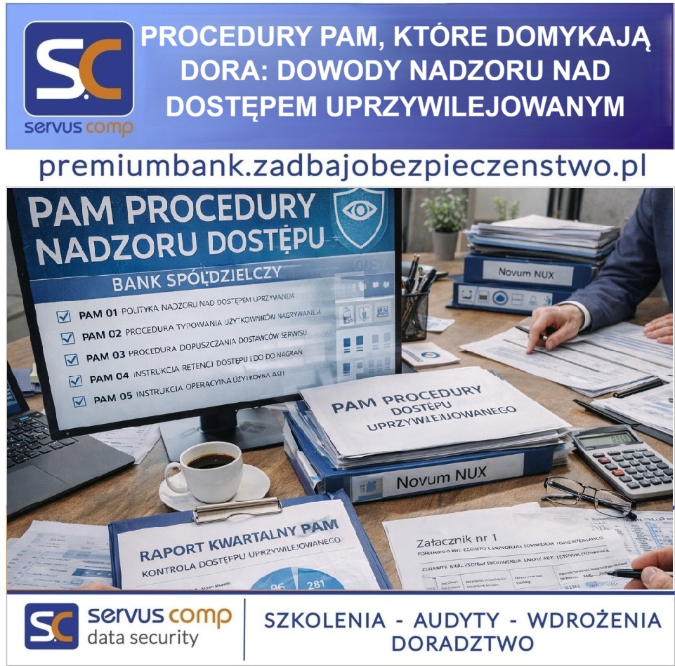 #PAM #DORA #BankSpoldzielczy #Cyberbezpieczenstwo #BezpieczenstwoICT #ZarzadzanieRyzykiemICT #KontrolaDostepu #DostepUprzywilejowany #PrivilegedAccessManagement #NagrywanieSesji #NadzorNadAdministratorami #AudytIT #AudytDORA #KNF #EBA #RTS #Compliance #Governance #ABI #ASI #NovumNUX #OutsourcingICT #DostawcyICT #BezpieczenstwoInformacji #RejestryiDowody #RaportDlaZarzadu #OperationalResilience #OdpornoscCyfrowa